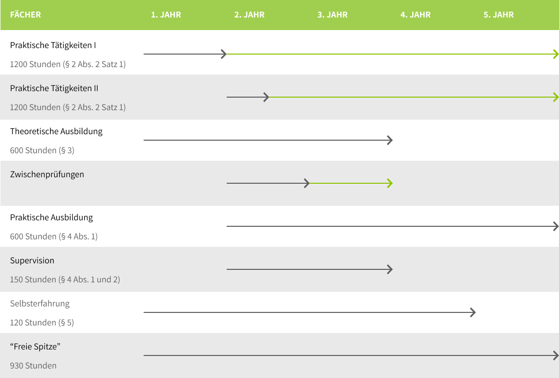 Die Ausbildung kann als dreijährige Vollzeit– oder als fünfjährige Teilzeitausbildung durchgeführt werden. Das Theorie-Curriculum ist bei beiden Formen auf 3 Jahre ausgerichtet, da erfahrungsgemäß mehr Interesse an einer zügigen Absolvierung der Theorieabschnitte besteht. Bei 5 jähriger Ausbildung kann dann die praktische Ausbildung entsprechend gestreckt werden.